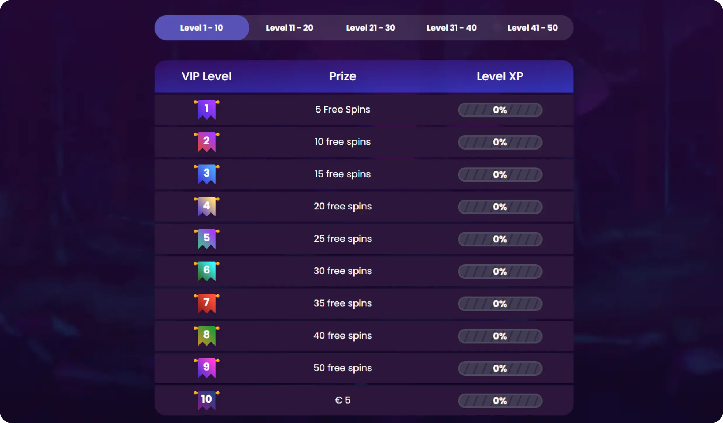- Program VIP z 50 poziomami, spinami i gotówką