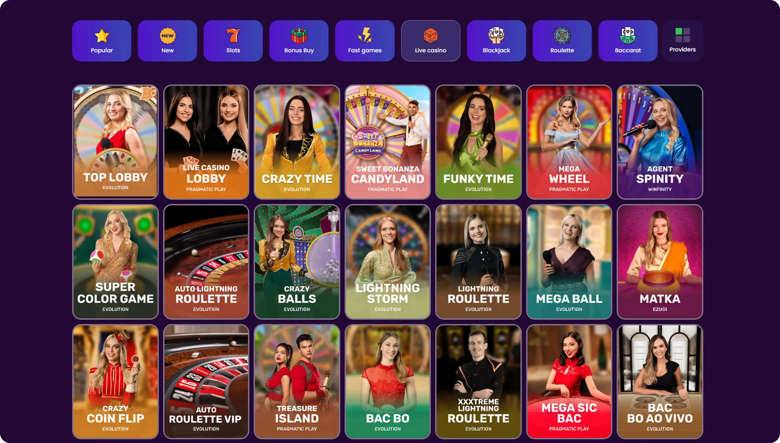 - Game Shows: Crazy Time, Sweet Bonanza Candyland, Mega Ball